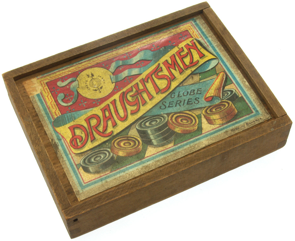 Lovely set of 24 polished hardwood draughts men by Globe, made in Bavaria. Complete with original wooden box with printed label. The box measures 14.5 x 11cm. The draughts pieces measure 30mm diameter x 8mm