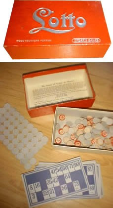 Spear's Lotto game in excellent condition with wooden numerals, playing boards and die-cut covers, most of which are still attached to each other. The instructions are printed inside the lid. 17 cm. (7") long.