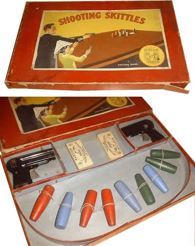 Rare shooting skittles game with a slightly tatty box but contents in good condition comprising a complete set of nine pins, two metal guns in working order and amunition boxes with some torn edges and alas only one wooden bullet. Made by Wells of London, box 44cm (17") long