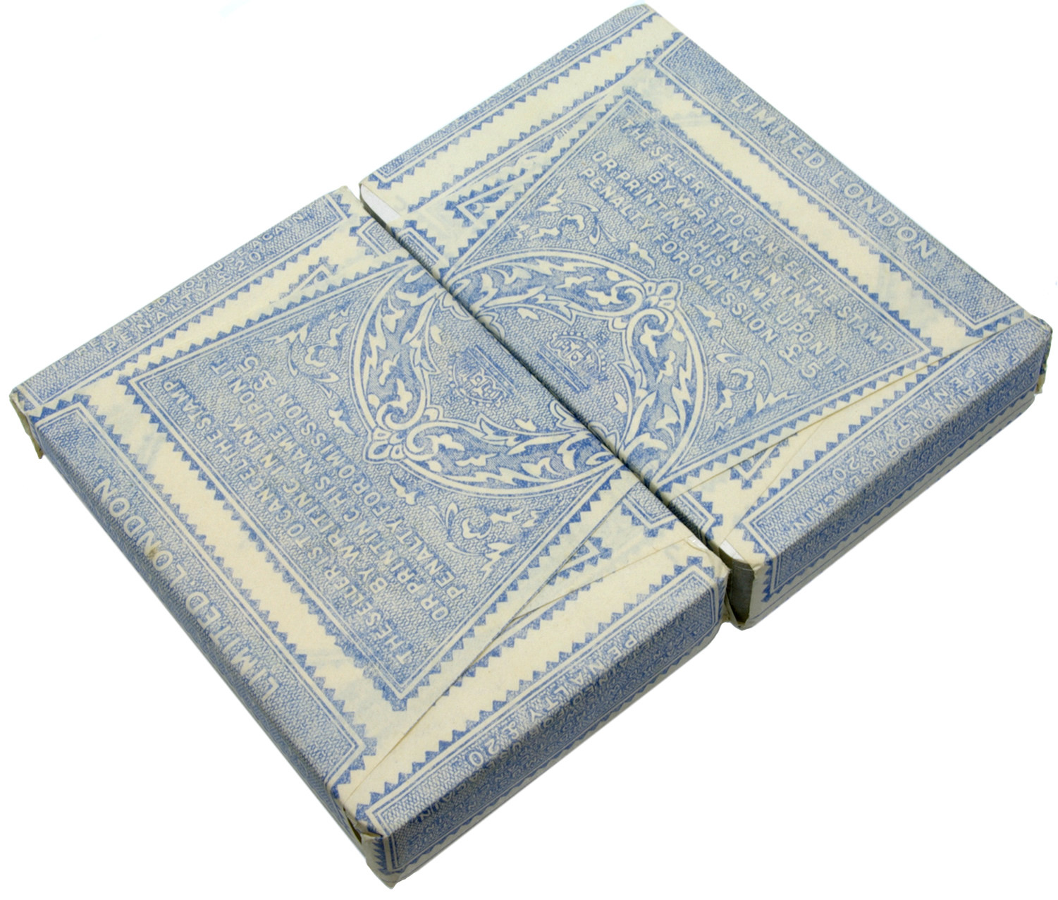 Sealed twin pack of lovely patience playing cards by De La Rue stationers London, in original three pence duty wrappers.