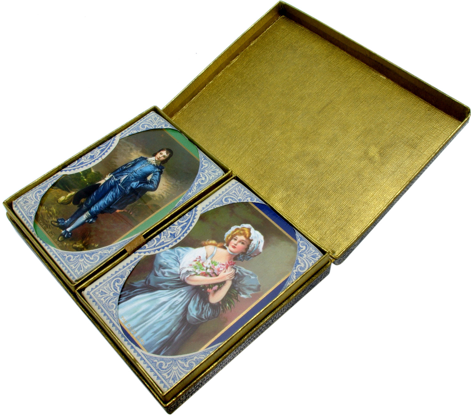 Sealed twin pack of lovely playing cards by De La Rue stationers London, in original three pence duty wrappers. The card backs have attractive Blue girl and Blue boy designs printed on them and are in their original presentation case.