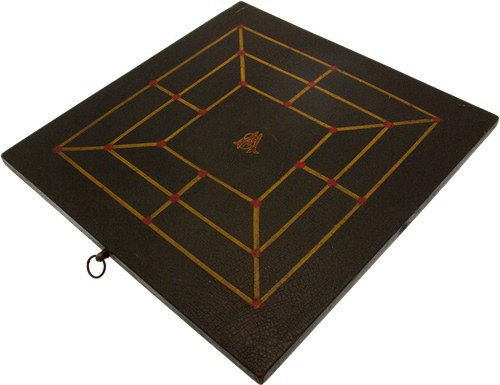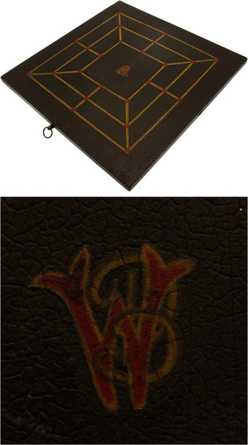 Very rare and early painted nine men's morris game board probably from a tavern. The surface has a "crackle-glaze" appearance where the lacquer has agedwhich adds to its' charm. There is a crest painted on the centre with the letters WB and a small brass hanging hook. 26cm