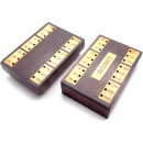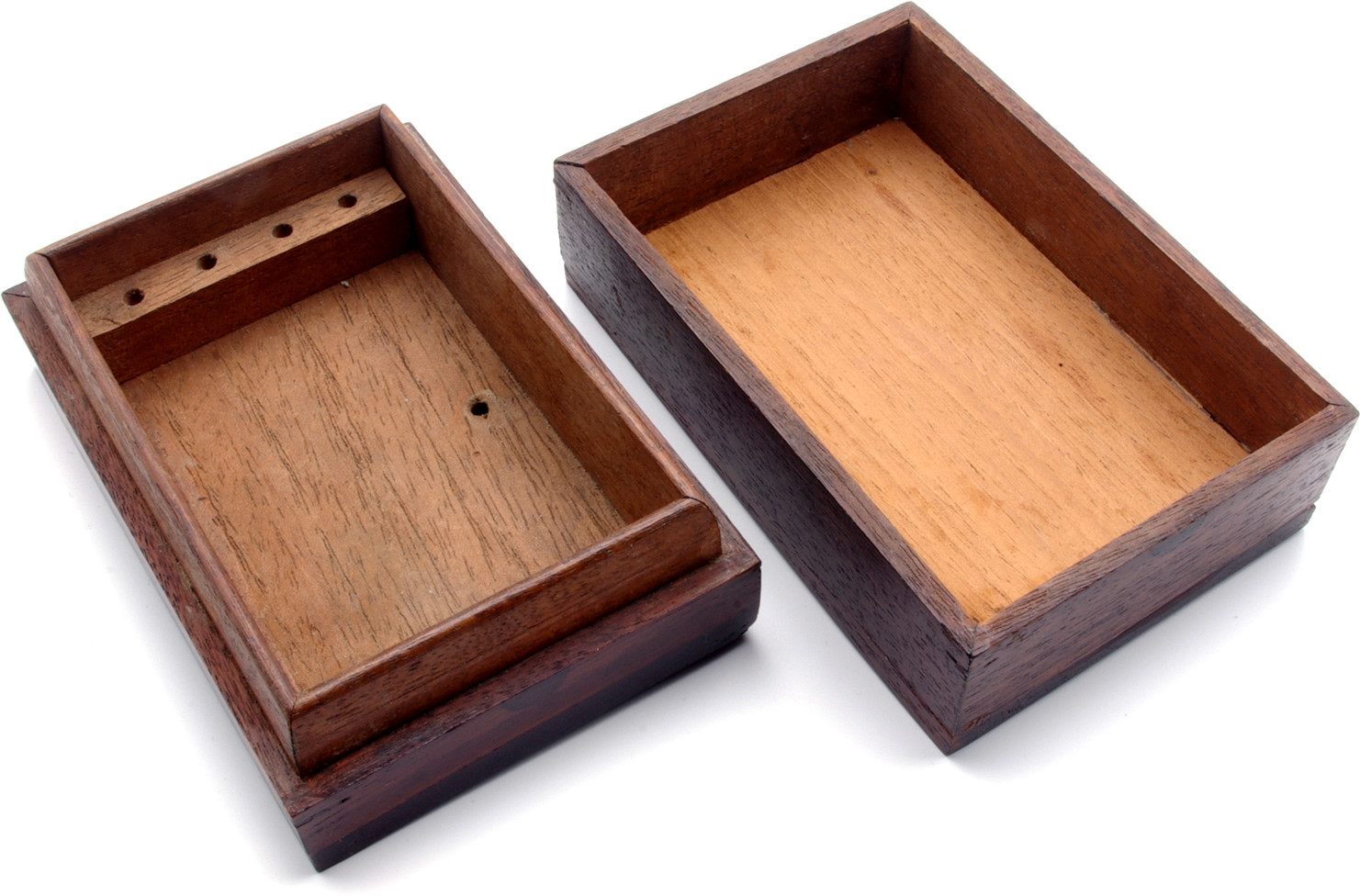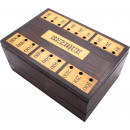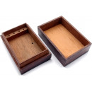 Solid mahogany box with inlaid scoring panels. The box opens into two pieces to create a pair of scoring devices and when closed has a space for playing cards and scoring pegs. Supplied with a new set of standard 25mm brass and chrome cribbage pegs. Dimensions when closed: 13 x 9 x 6cm