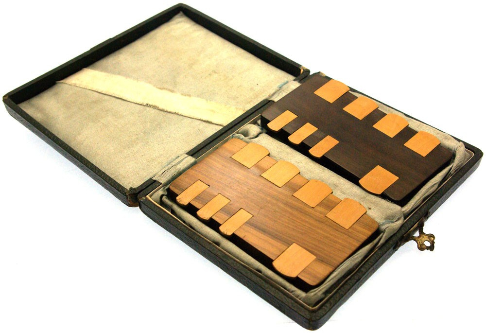 Beautiful highly polished hardwood Whist markers. Each 9.5cm long. The different sized tabs on each side are flipped up or down to "keep a tab" of points. Good working condition, supplied in original leatherette presentation box.