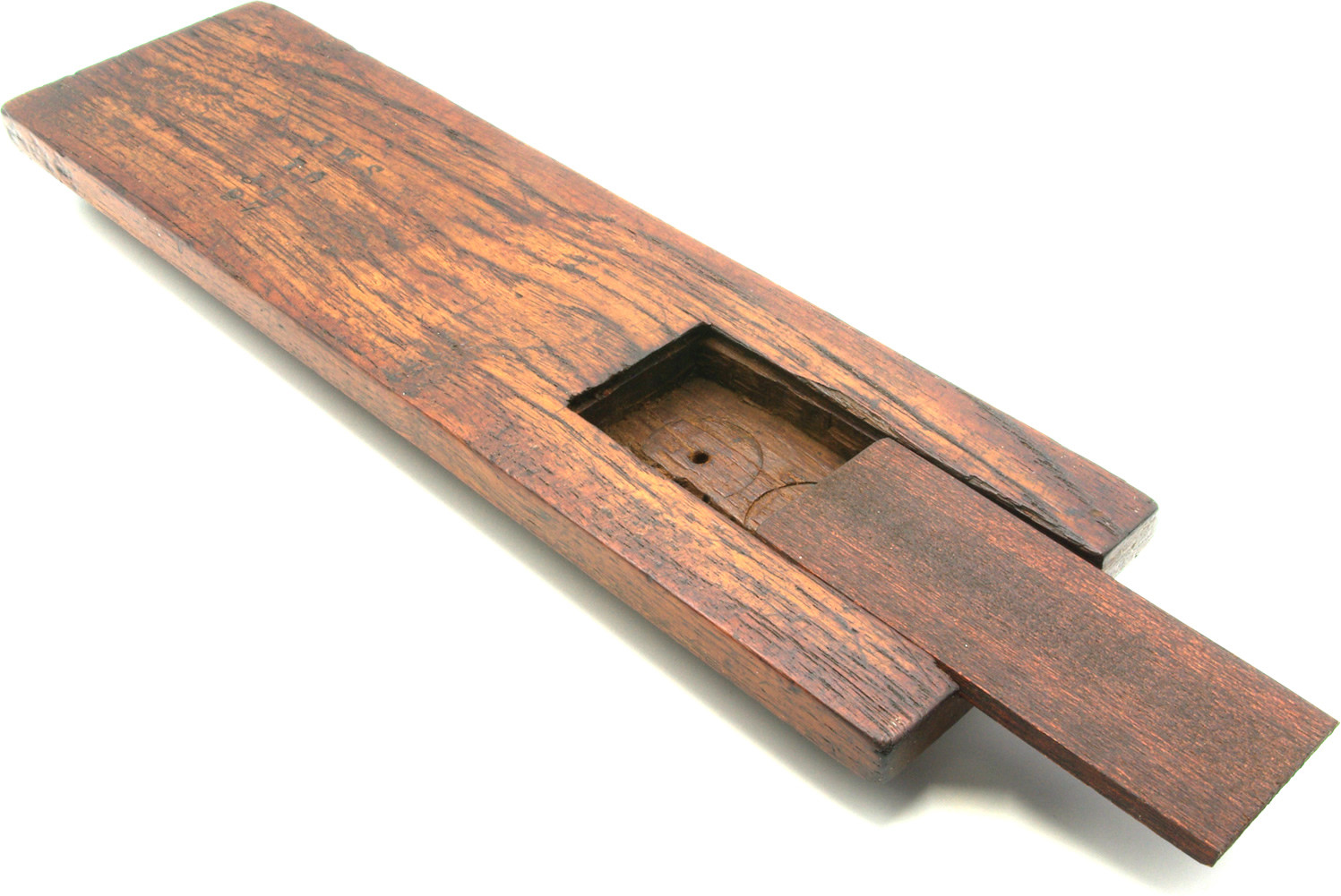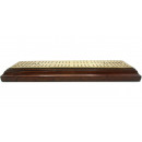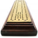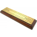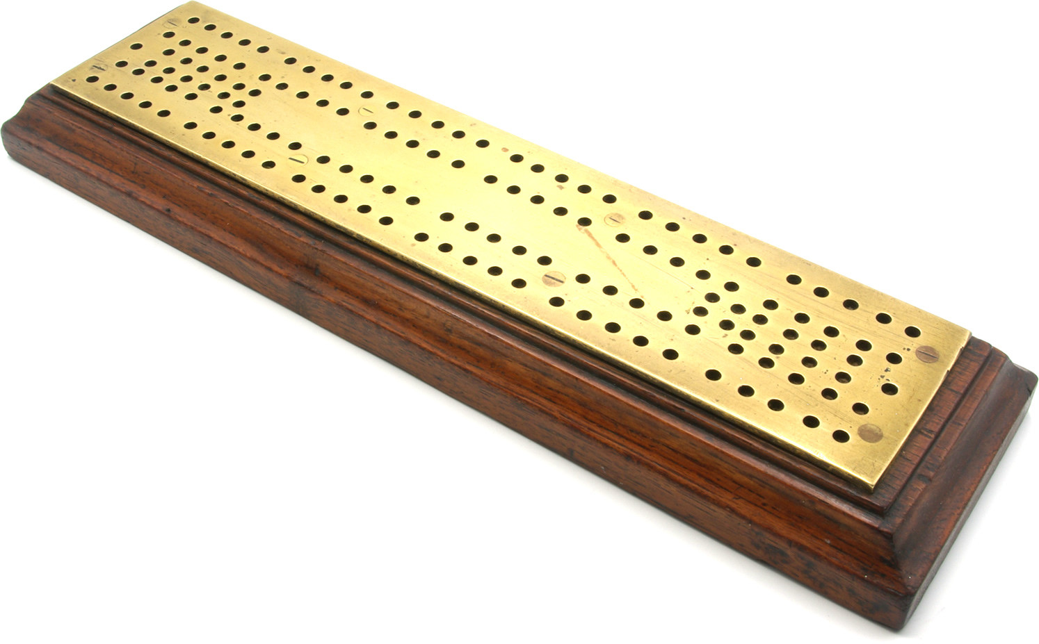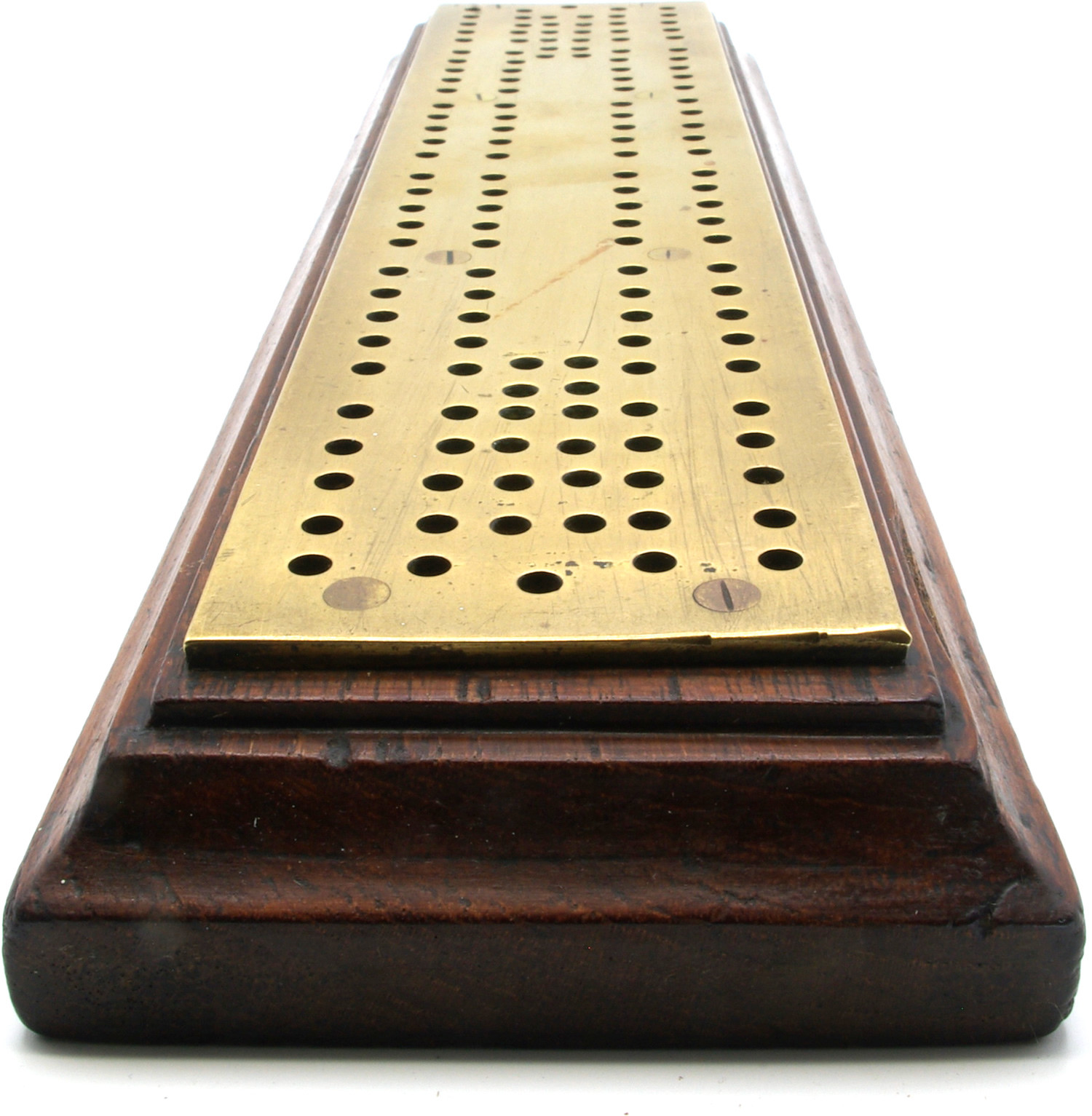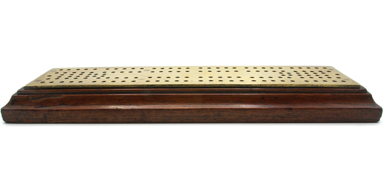 Solid dark oak antique cribbage board with brass top and sliding peg compartment on the underside. 30 x 8 x 3cm with 3mm diameter peg holes. Our antique cribbage boards are sold complete with a new set of standard 25mm brass and chrome cribbage pegs. Playing card for size indication only.