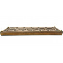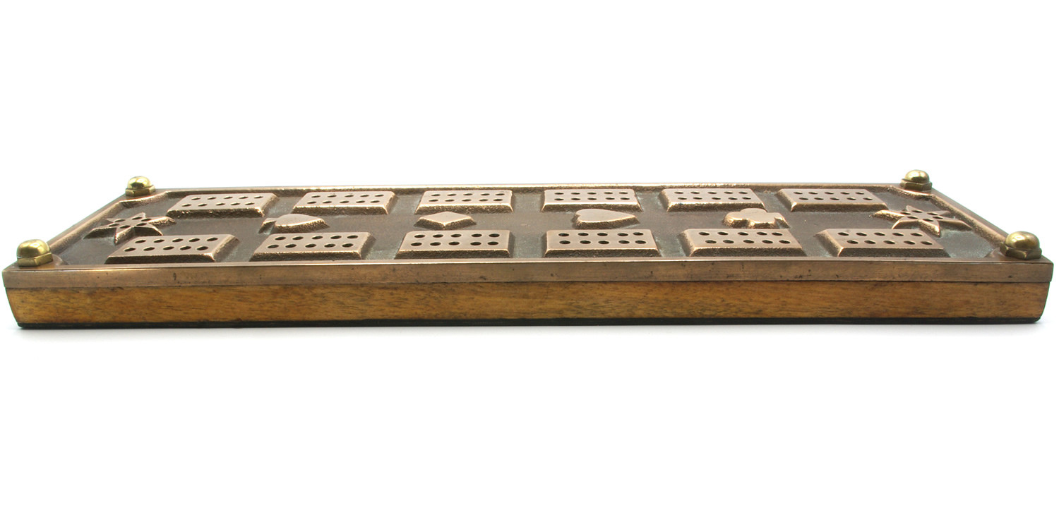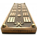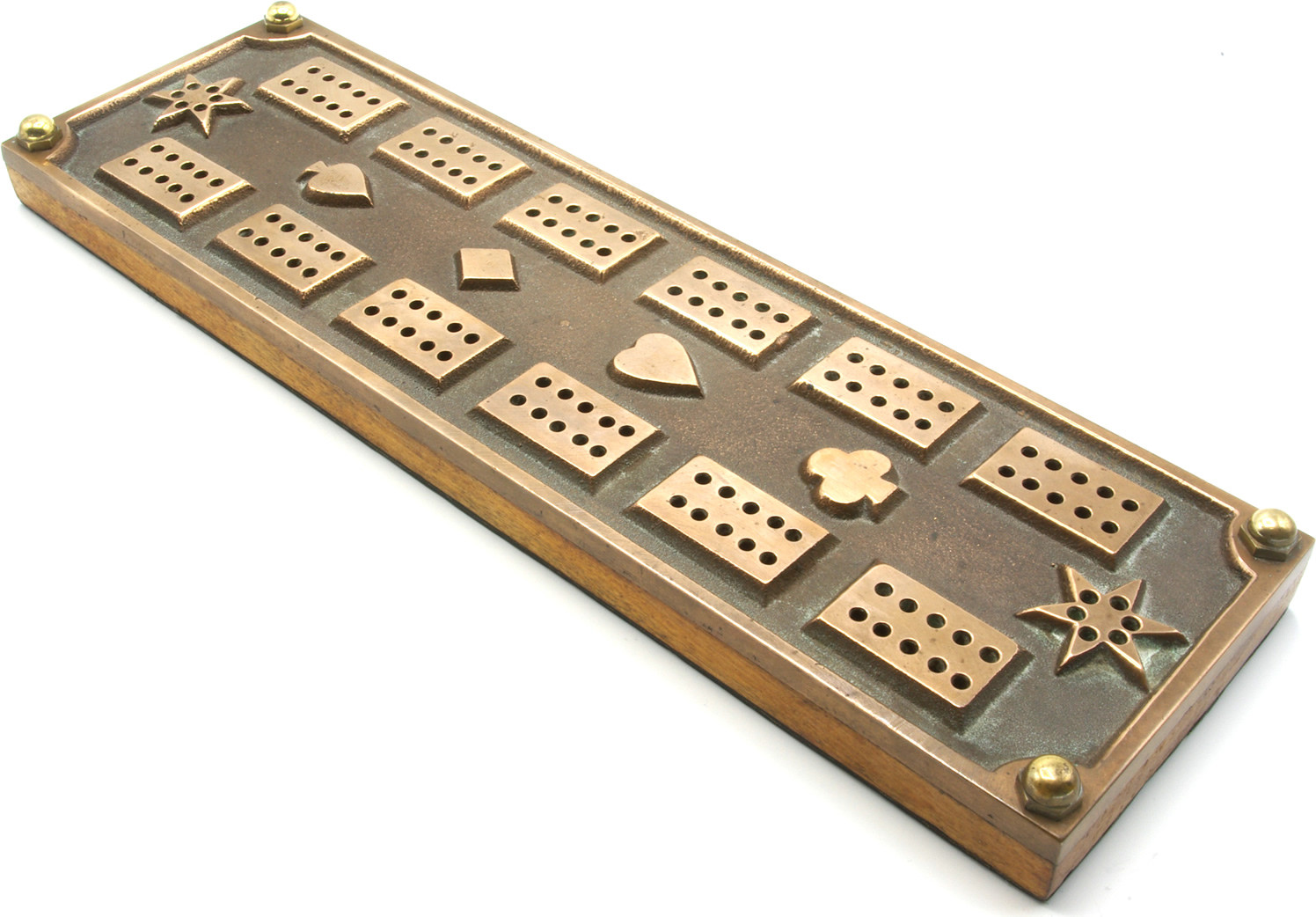 Solid Oak cribbage board with cast brass top, a very heavy and solid piece. 31 x 9 x 3cm with 3mm diameter peg holes. Our antique cribbage boards are sold complete with a new set of standard 25mm brass and chrome cribbage pegs. Playing card for size indication only.
