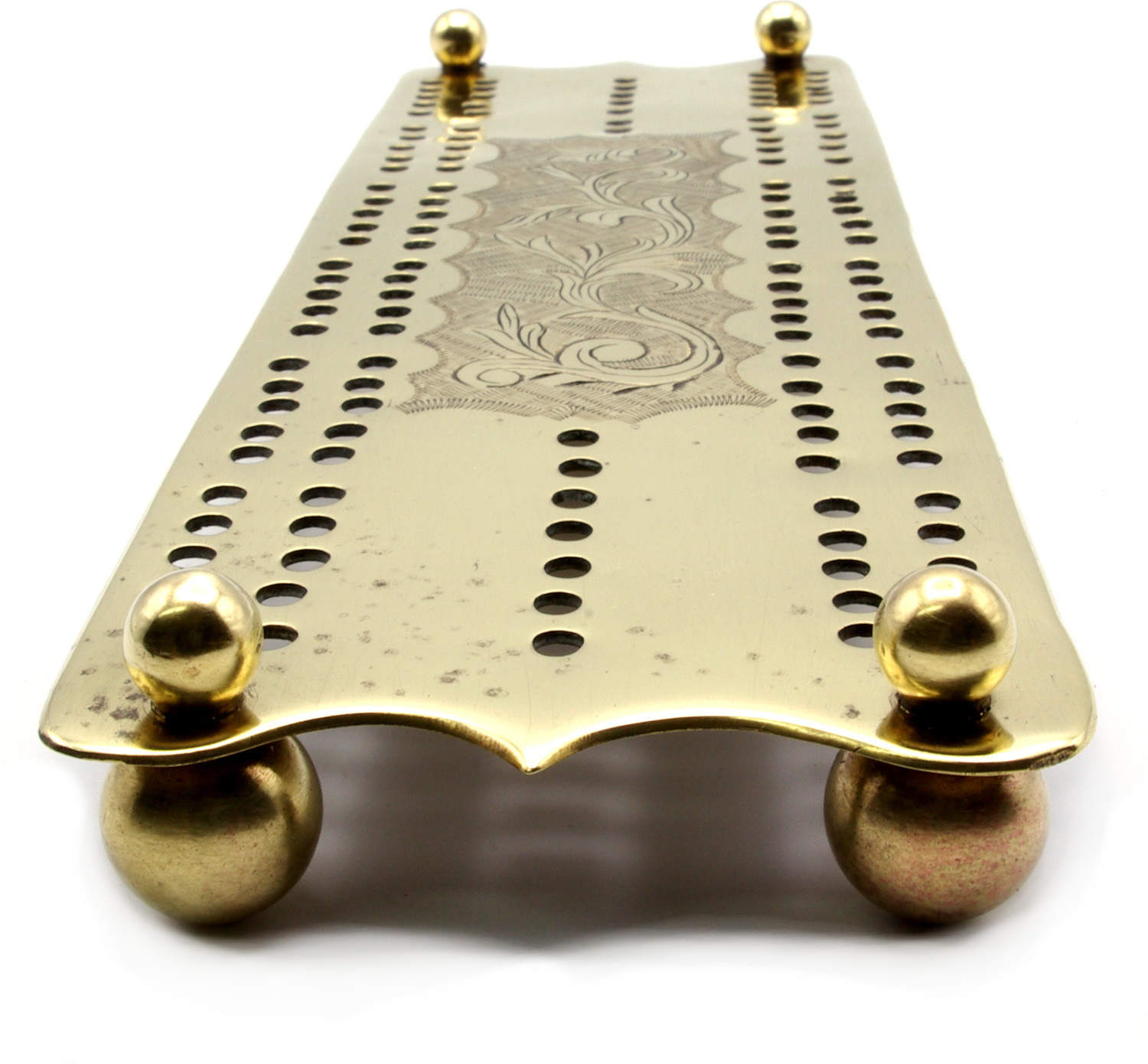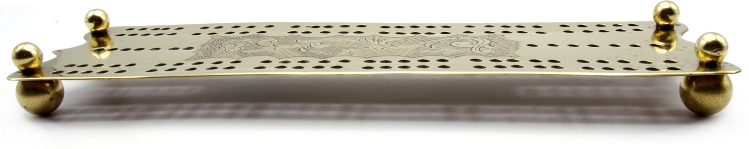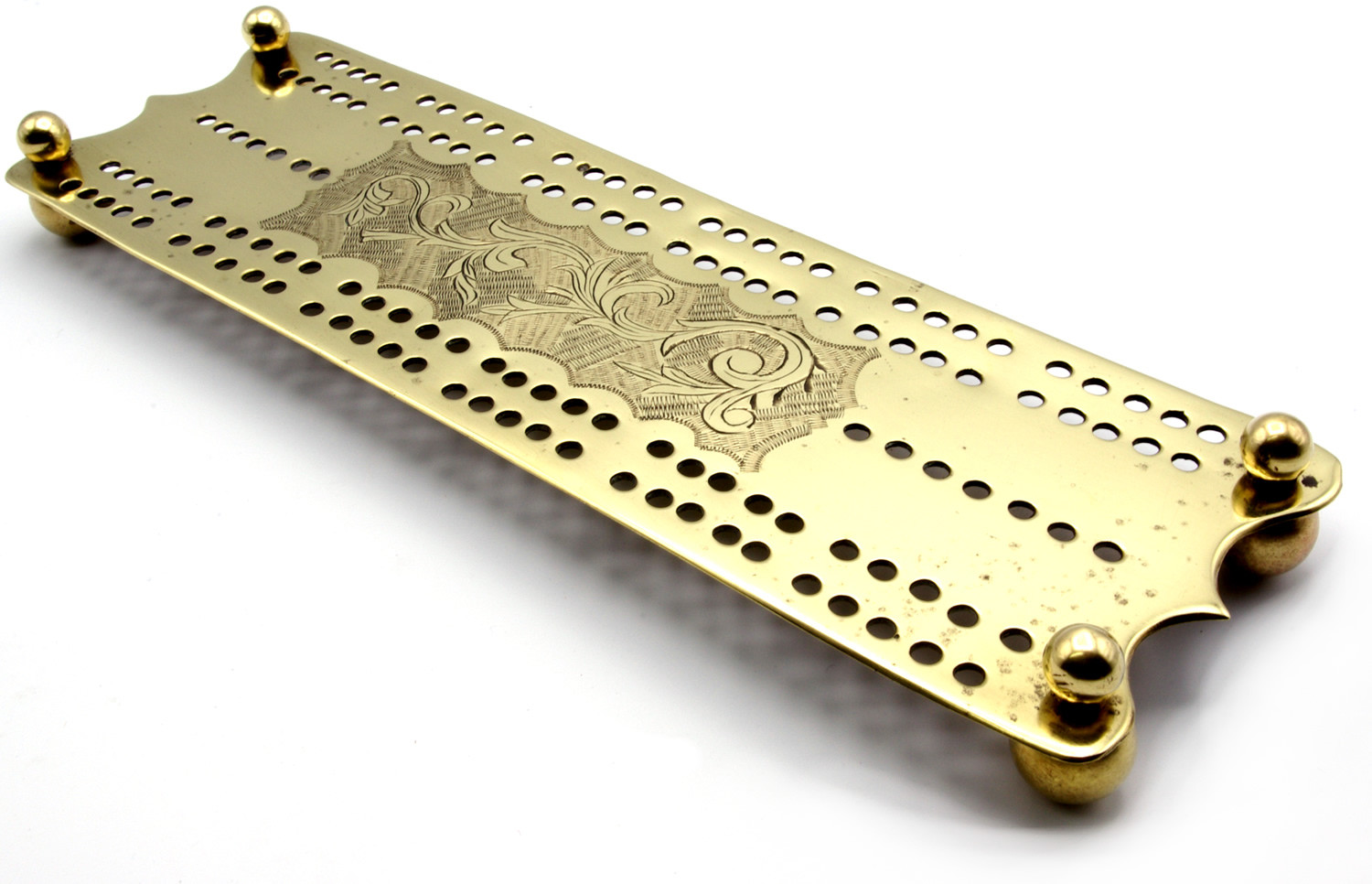 Lovely engraved brass cribbage board with brass ball feet and detail.