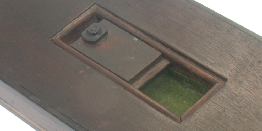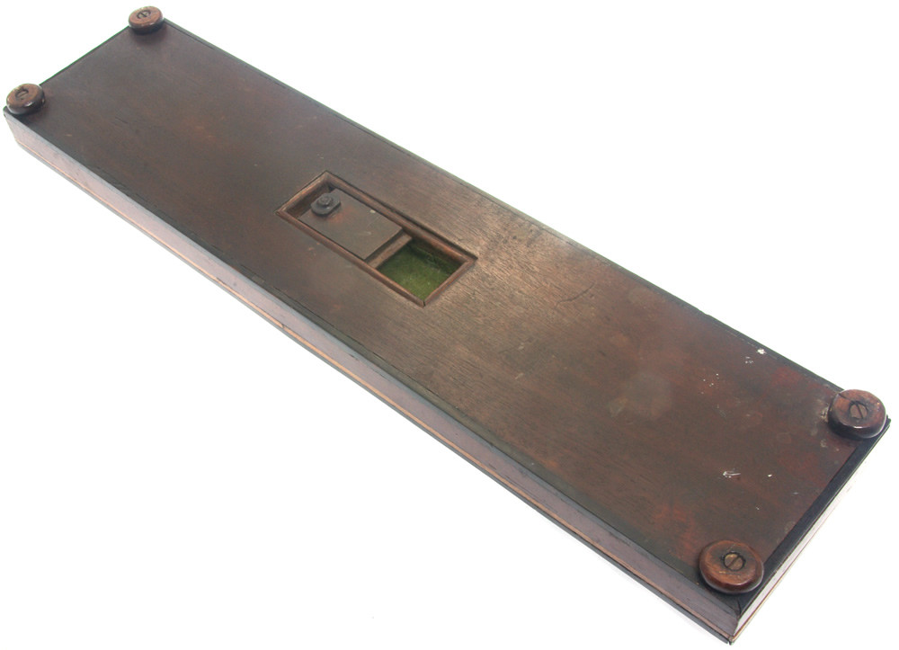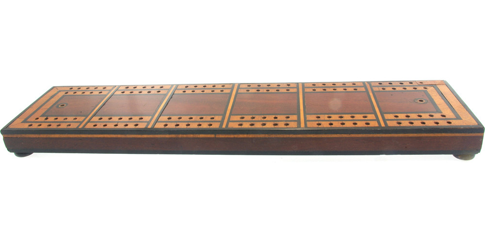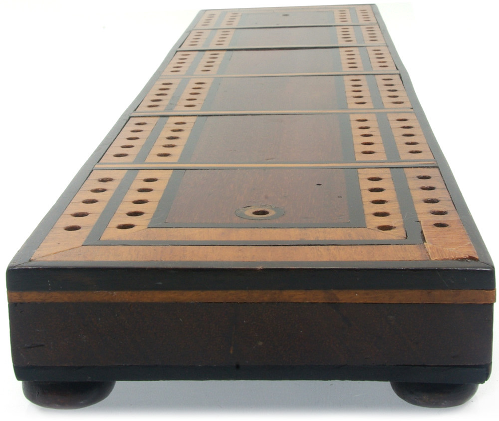 Large 39cm (15.5") cribbage board inlaid with various hardwoods. The underside has turned bun feet and a spring-loaded peg compartment. Dimensions: 39 x 9 x 3cm Hole size 3mm. Our antique cribbage boards are sold complete with a new set of standard 25mm brass and chrome cribbage pegs.