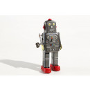 Chunky Grey Mechanical clockwork Robot, insert key to wind and watch him walk with stop start function on his chest. 20cm tall
