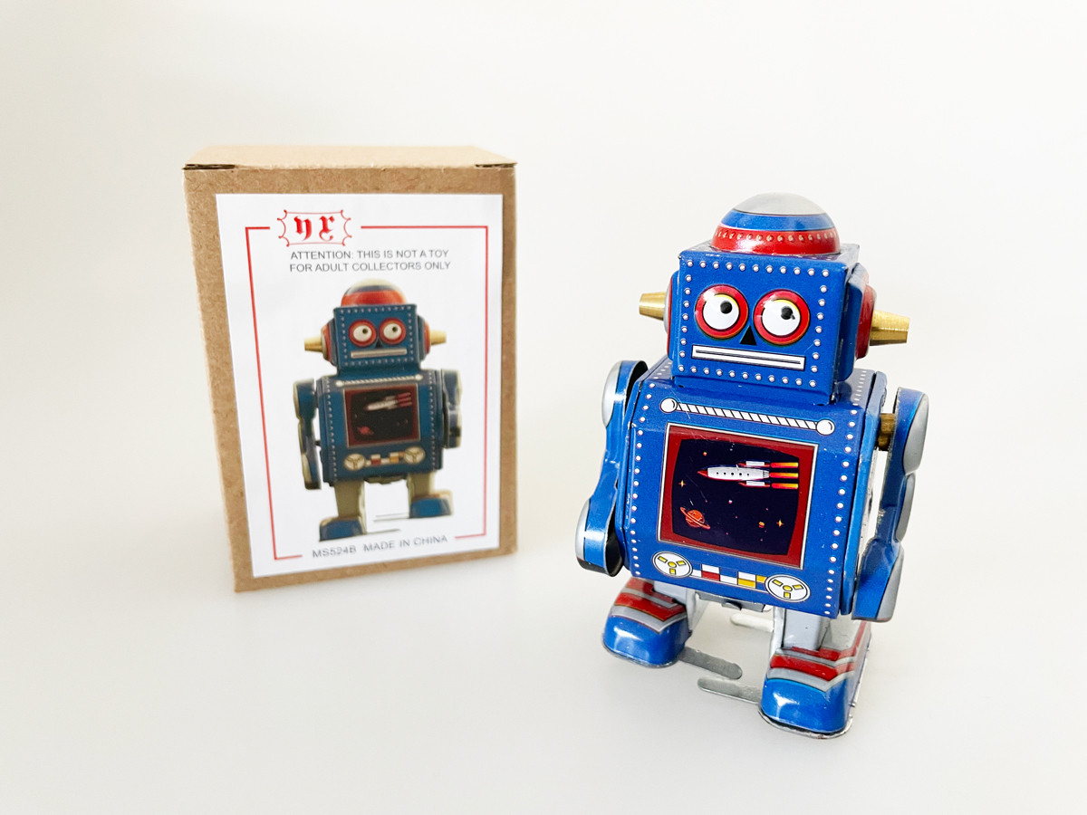 Tiny robot with wind-up mechanism. When you wind it up with its key, the little robot will happily march off. Measurements: 5 x 4 x 8 cm. Collectible - not suitable for children under the age of 14.