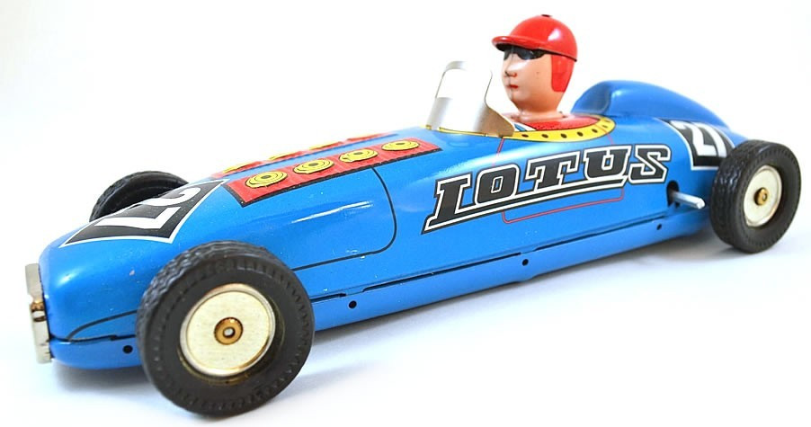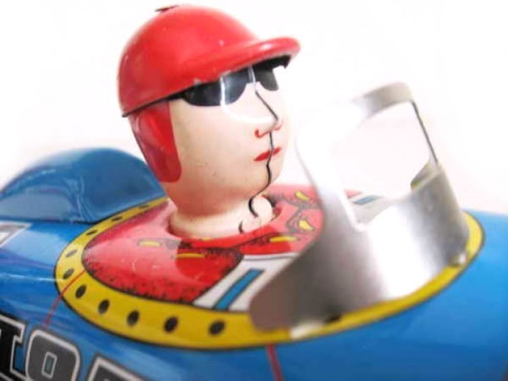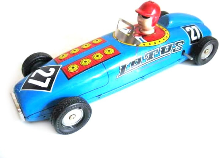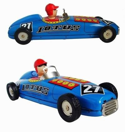 Early 20th century - style, wind - up racing car. The racer features the racing no. "27" on the front and back - sides, rubber tyres, 8 cylinders sticking out of the bonnet and a cool - looking driver (he's wearing goggle shades!) Length 24cm approx.