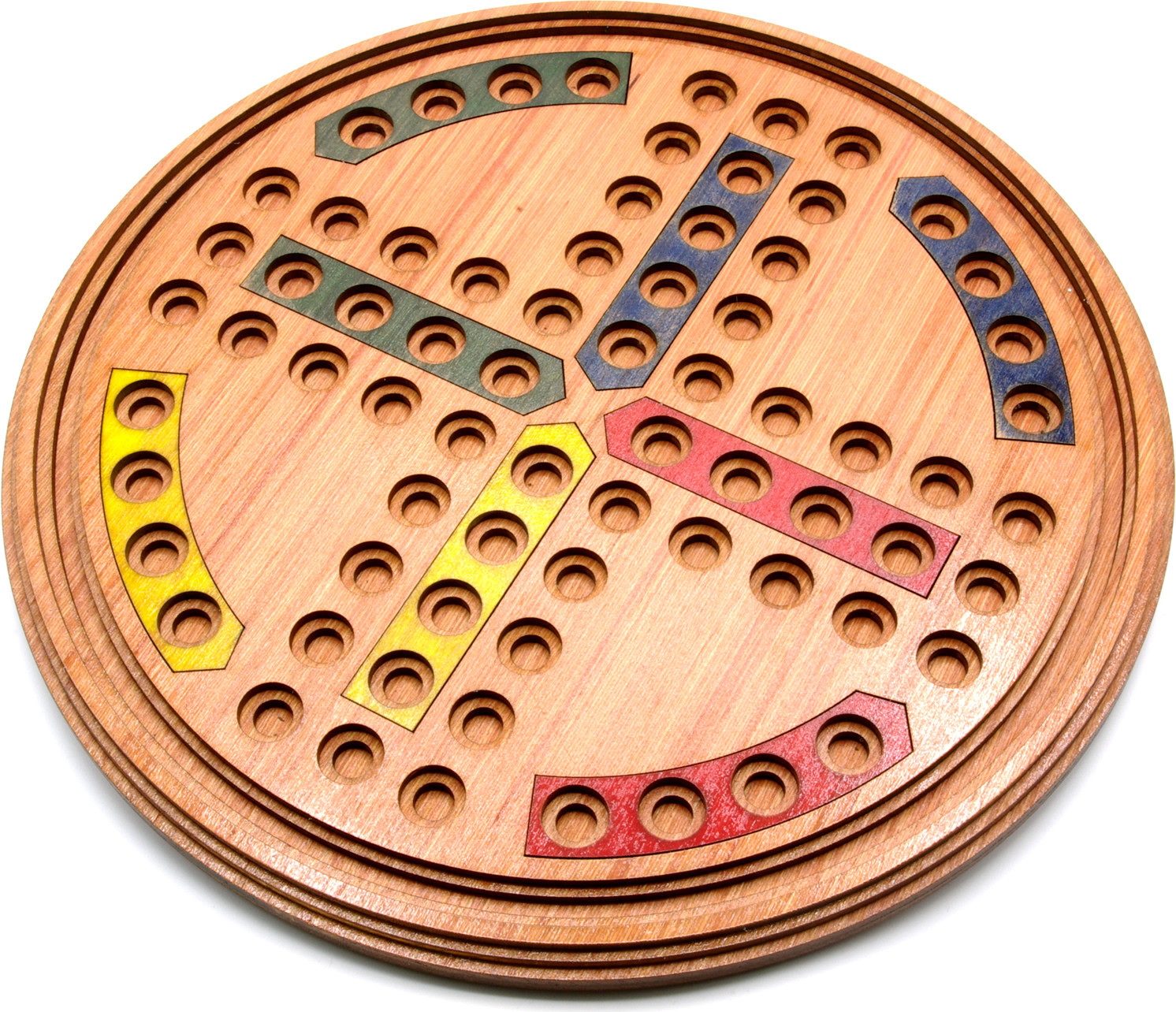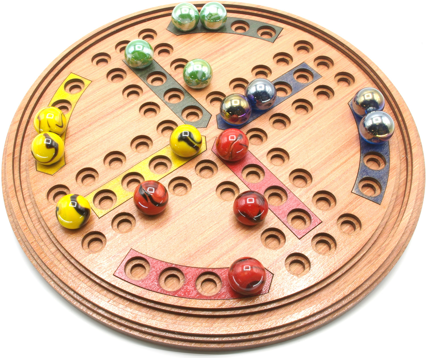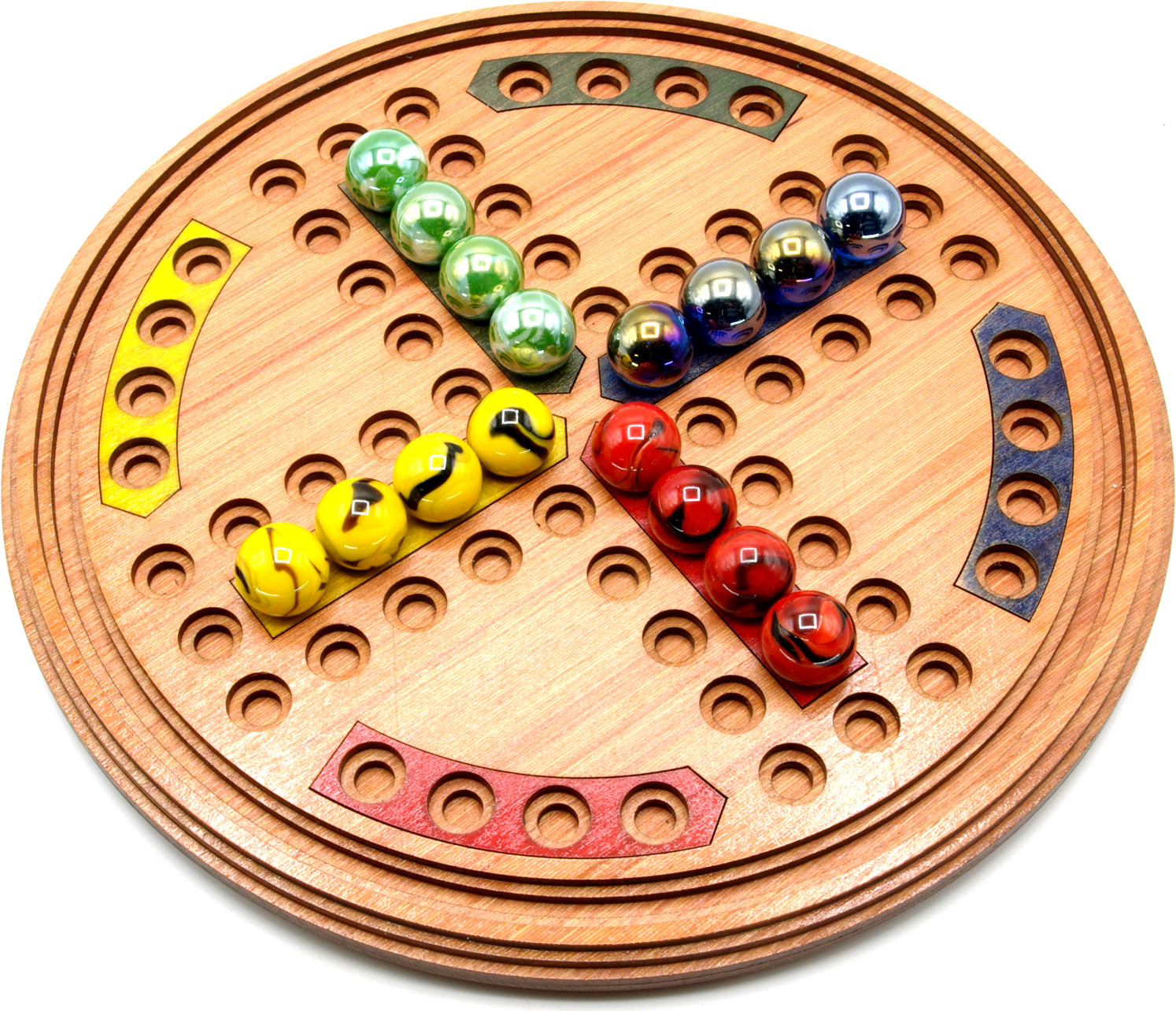 Traditional 4-player game, wooden construction with glass marble playing pieces. 30cm diameter board with 20mm playing marbles. Made in the UK from FSC certified sustainable timber.