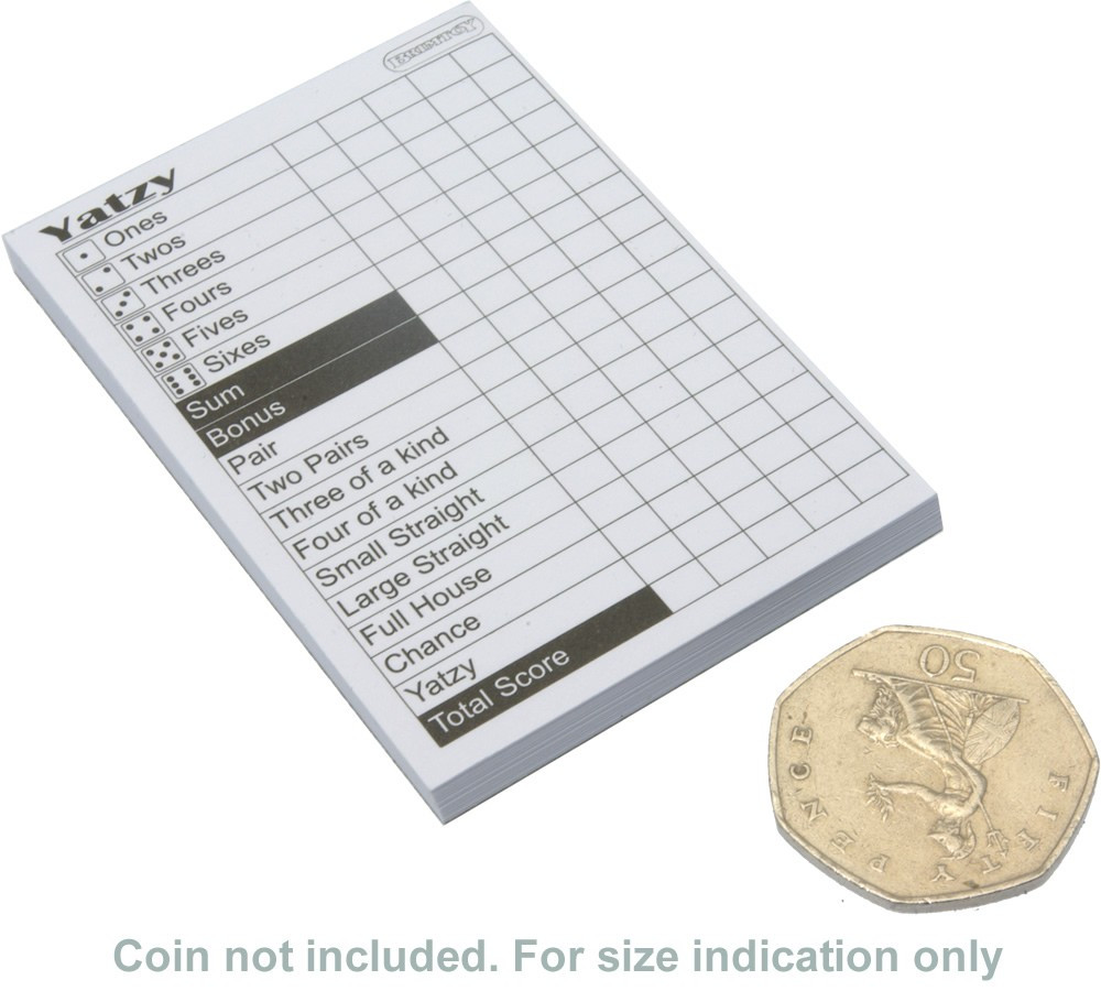 Can be played anywhereAge 8+ for 1 or more playersContains 5 dice, Yatzy score pad, pencils and rules.