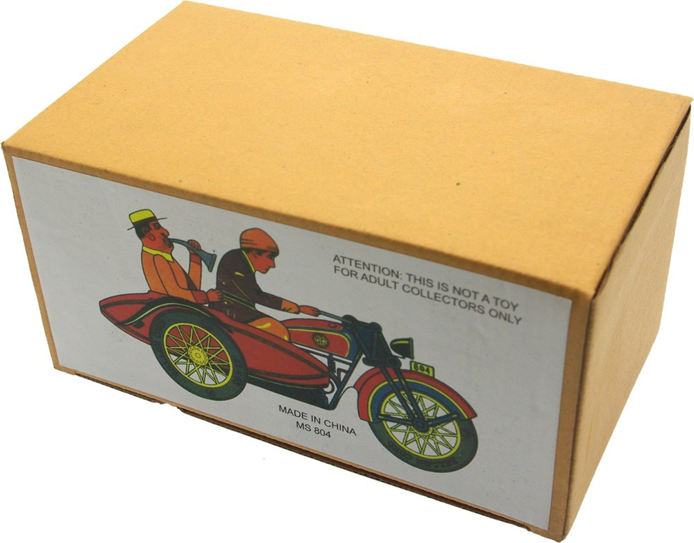 This is a reproduction of the Paya "Tut Tut Motorcycle", originally made in Alicante Spain in 1932. It features a well dressed rider and passenger blowing a bugle on a detailed motorcycle. Wind-up his all-tin bike and our rider will quickly drive ahead. 18cm long. Made in China.