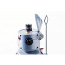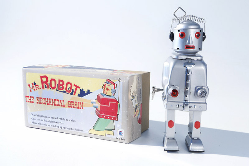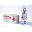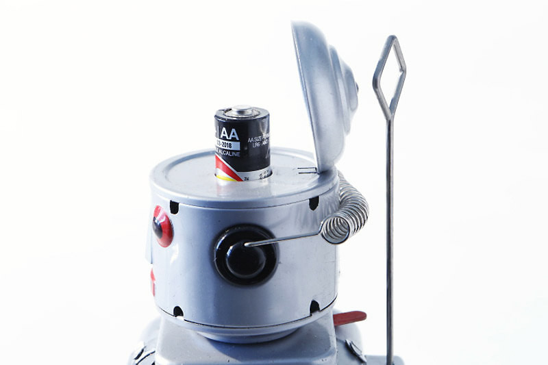 Wind-up, flashing light, walking tin toy robot . This Silver coloured robot flashes his lights (one red, one white) while walking. There is also a tap and a lever at the back. The tap controls the walking (ON and OFF) and the lever controls the lights (ON anf OFF). Requires 1 x AA battery. 21cm approx.