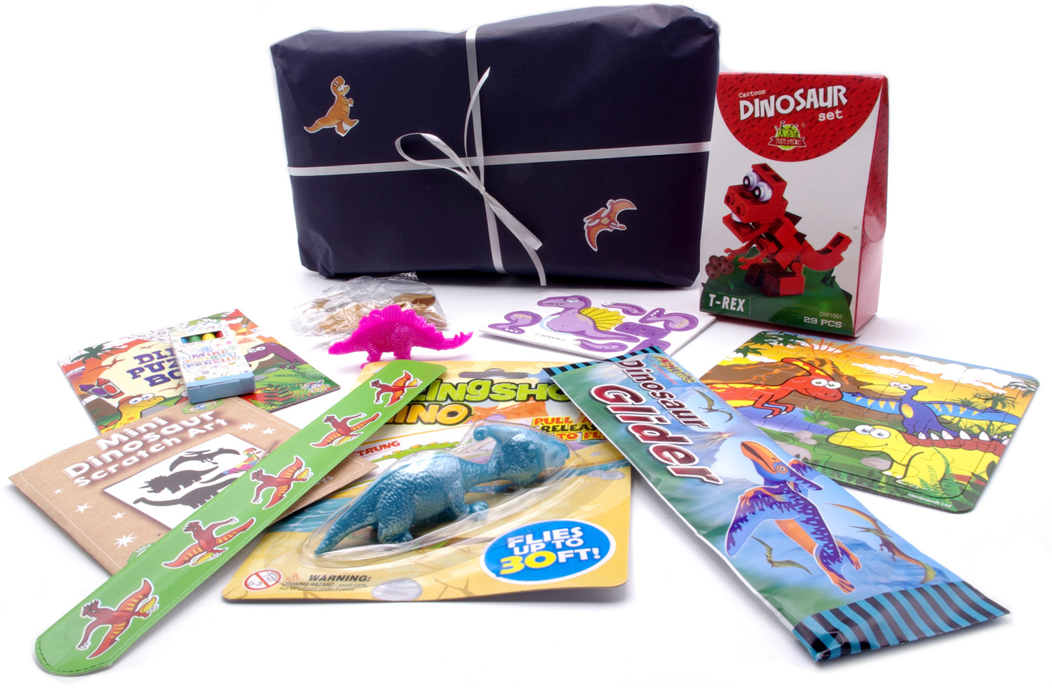 Made by us, to save you time and hassle. A hand-made Dinosaur Pass The Parcel set filled with our Dinosaur themed toys in every layer. Parcels are made out of coloured unisex wrapping paper and crêpe paper (colours & products may vary). Ages 3+. We do not have a set list of toys making sure that these parcels can be ordered time and time again without necessarily receiving the same goods in each one. Products may include - glider, puzzle, eraser, mini springy, yo-yo, snap bracelet, 3-d puzzle kit, bouncy ball, pencil, brick kit, stretchy, clay kit