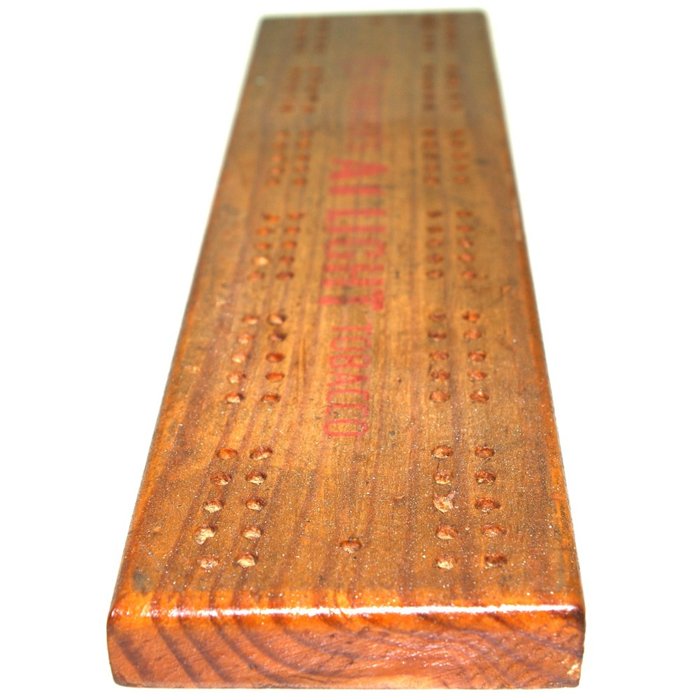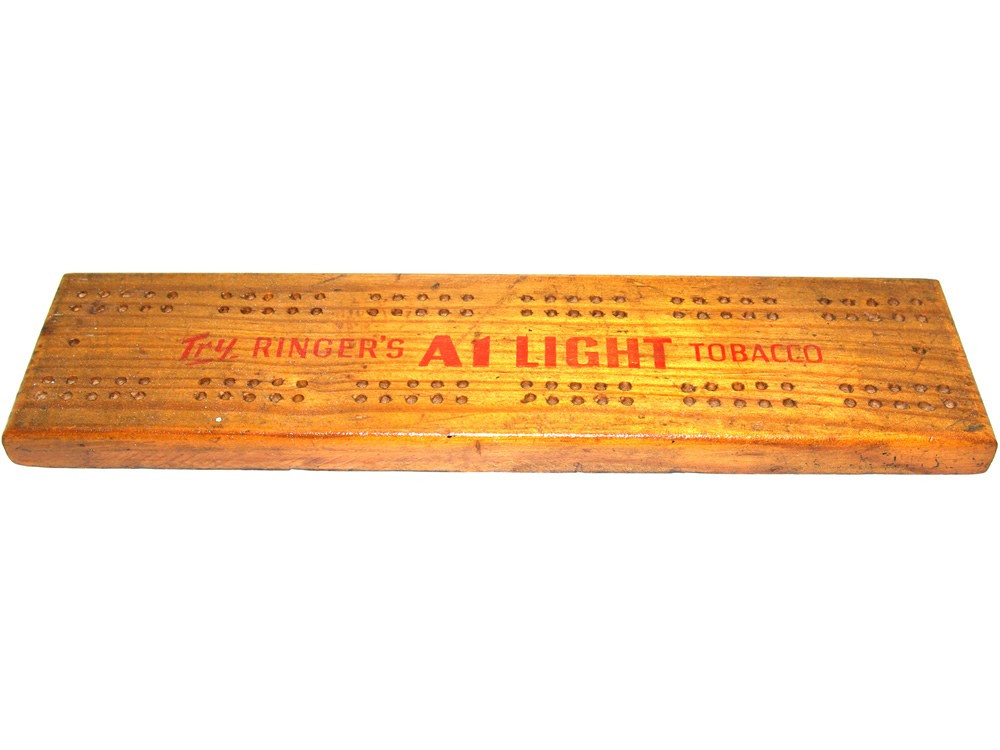 Solid Oak pub cribbage board with advertisement for Ringer's tobacco. A few dents and scratches commensurate with age but overall in good condition. 28cm long. Hole size: 3mm diameter.