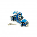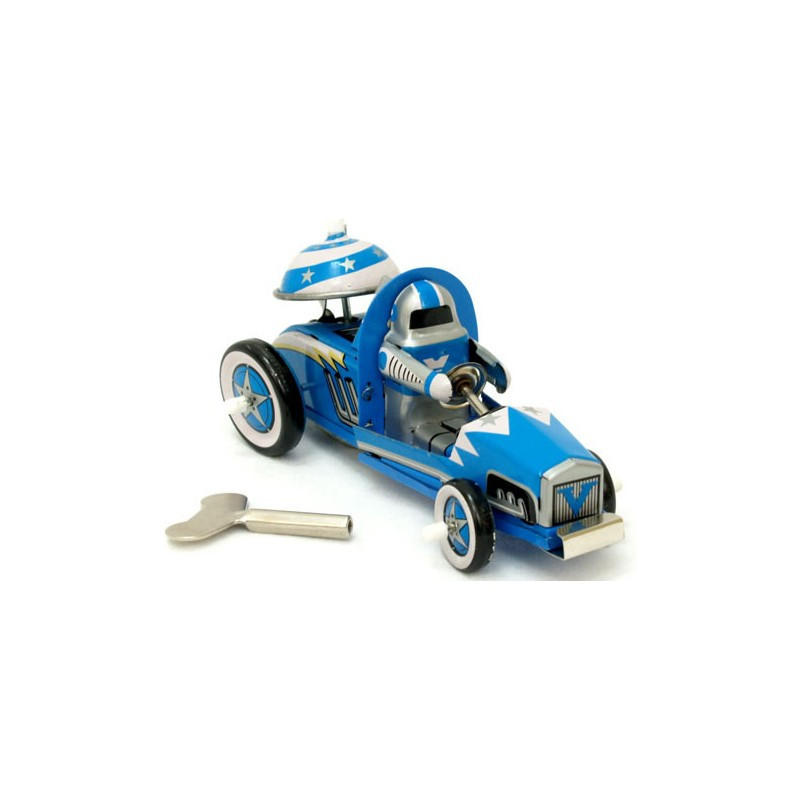 A reproduction of a Japanese tin toy race car of the 1950's, the silver robot drives the space racer with his arms straight ahead. The car rings the star striped bell as it explores new planets. Made in China, 14cm long, supplied in colour Retro Box.