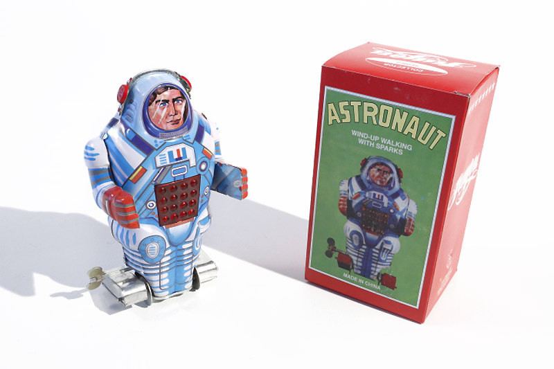 Astronaut exploring Robot with sparking chest. 16cm in coloured box with key.