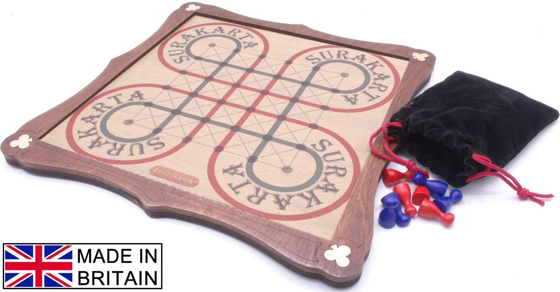 Surakarta is a traditional Indonesian battle game originally drawn in the sand and played with shells versus pebbles. The game is named after an ancient town on the island of Java from where it is believed to originate, and is remarkable by the unusual way in which enemy pieces are captured. The objective of the game is to take all of the opponent's pieces.