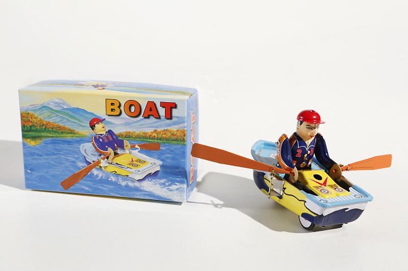 The boat moves with a realistic rocking motion due to the uneven wheels. While the man rows convincingly, pulling back at ech stroke. Clockwork, Made in China, 12cm