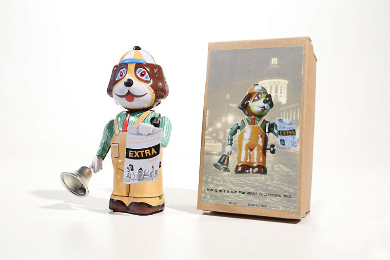 Dog with Newspaper and Bell, watch him spin round ringing his bell. 16cms Tall.