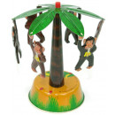 A tin carousel disguised as a palm tree with dangling monkees. The leaves at the top of the carousel rotate, carrying the the cheeky, dangling, banana munching monkees. 13cm approx.