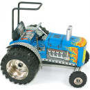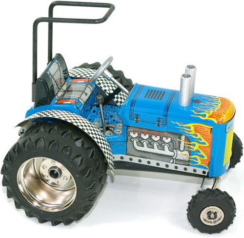 Wind-up DRAG RACE tractor. Scale 1:25 Features working 3 speed gear box, working handbrake, working steering wheel, a removeable rollbar and FLAMES! Added realism is induced by the appearance of 4 wheels at the rear axle. 15cm approx.