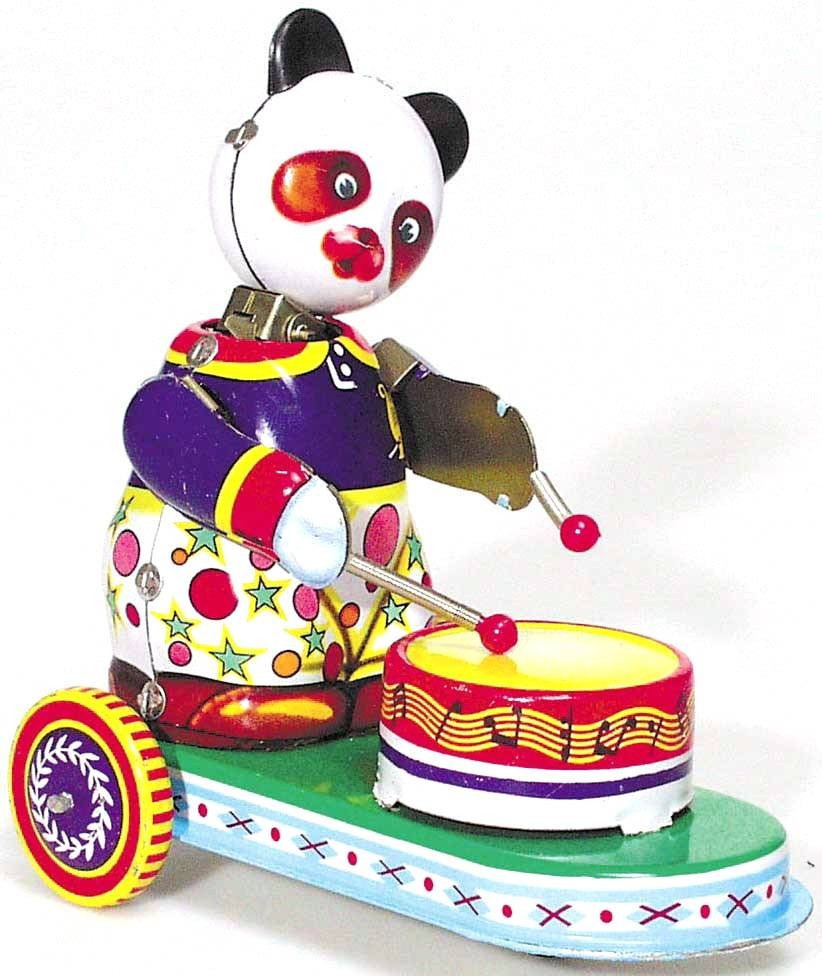 A wind-up lithographed panda cart that rolls around drumming while its head moves back and forth. Made in China, colourful box. 13 cm tall