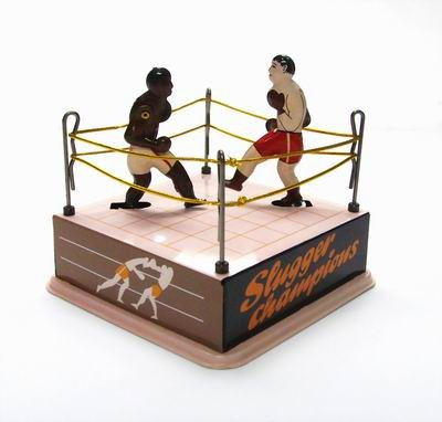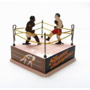 Wind-up lithographed tin boxing ring. Once wound, the boxers trot back and forth, jabbing at each other. Made in China. 13 cm wide.