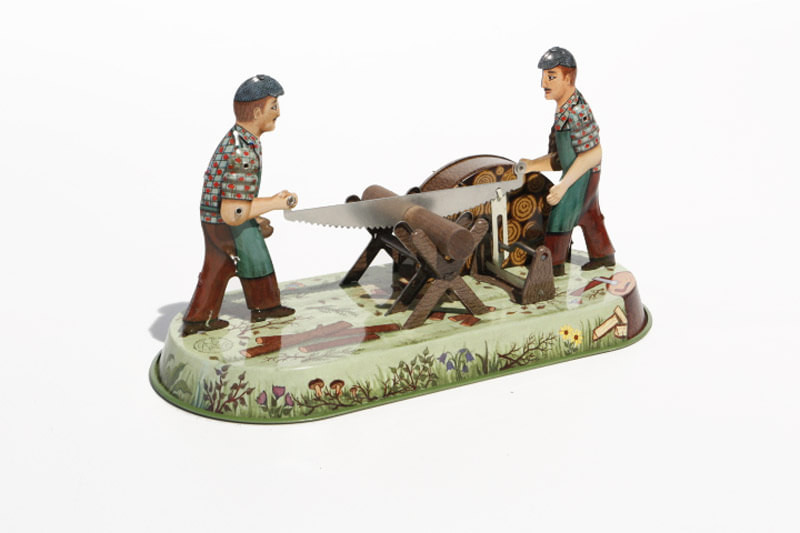 Measuring 23 x 12 cm. when wound, the lumberjacks saw back and forth. Made in Germany by Wagner.