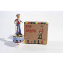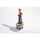The dancer is driven by the wind-up mechanism, which is located in the stage on which the dancer is moving in circles. The round base is the wind-up-key, start-stop-switch under the stage. Height 22 cm, Diameter 8 cm Fast tapping dancer on a turning stage.