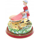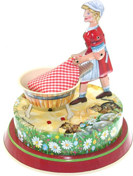 Great tin toy featuring a washerwoman. Measuring 14 cm, when wound, she rubs her washing back and forth against the washer board. Clockwork. Made in Germany by Wagner.