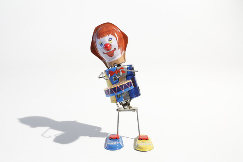 Clown playing the drums height: 24 cm, with wind up function Made in India