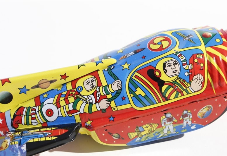 Lithographed tin toy rocket, friction driven with sparking mechanism that lights up the nose cone as it zooms along. 26cm.