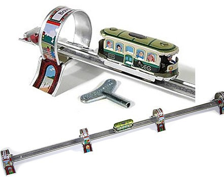 Wind - up tin tramway and tram.