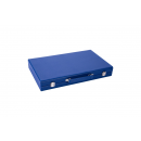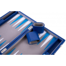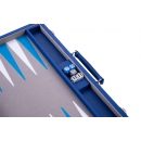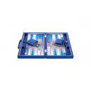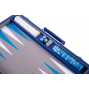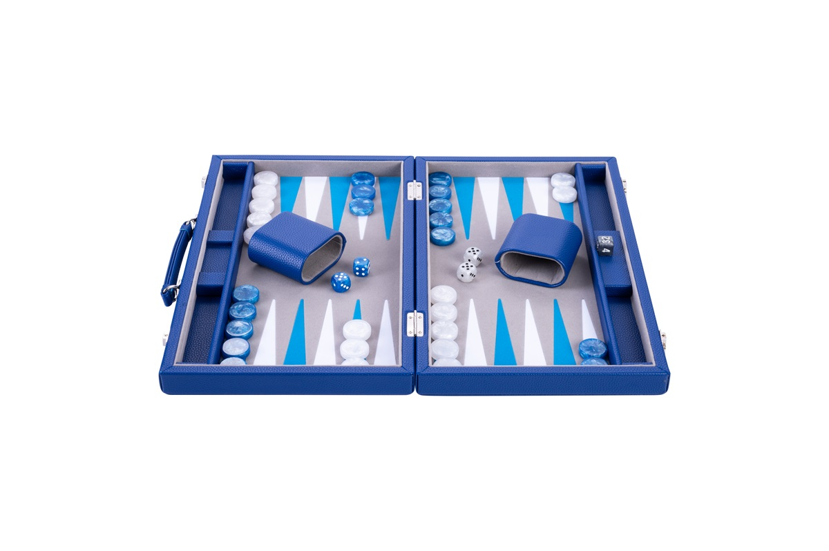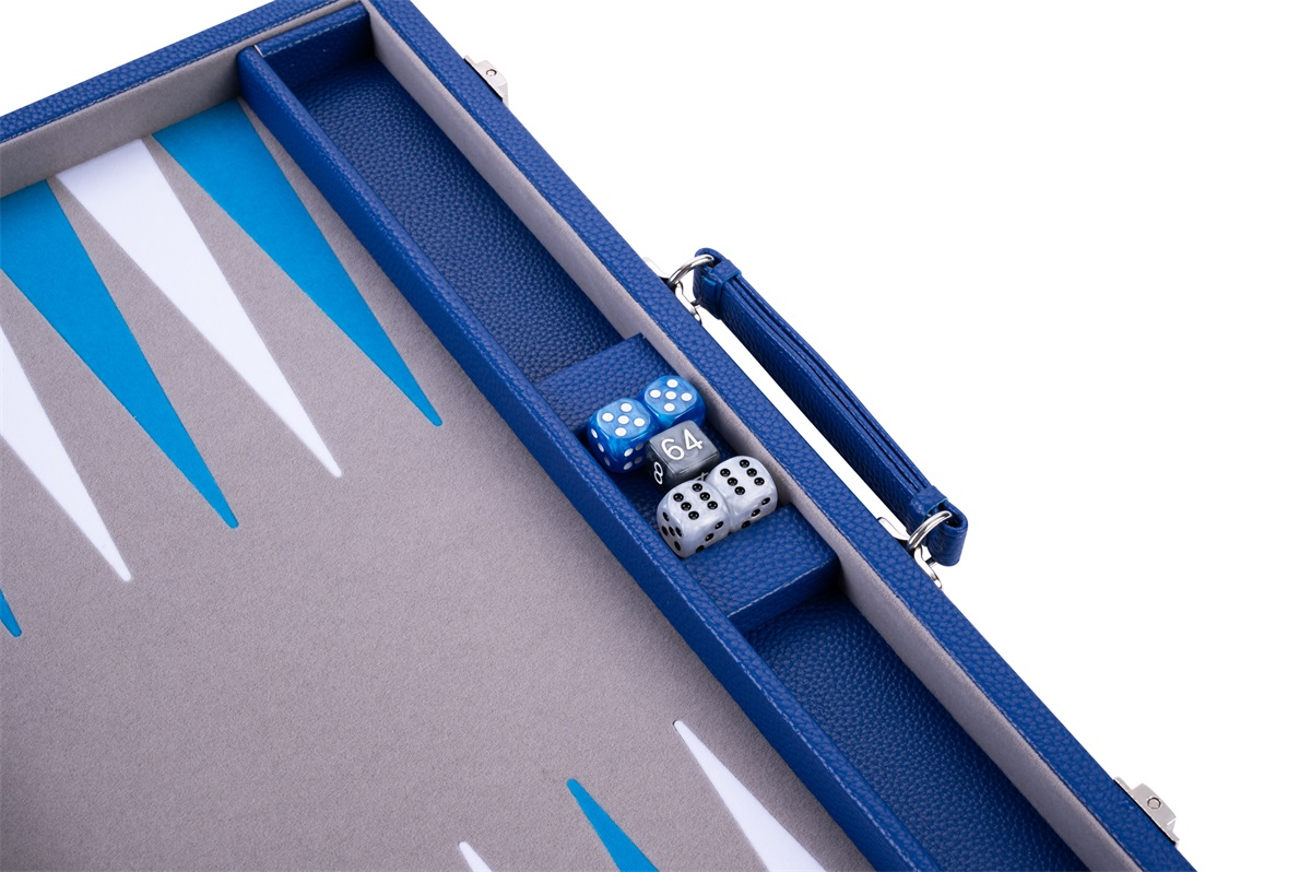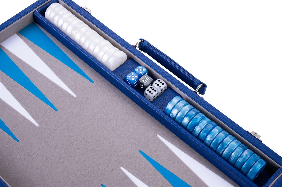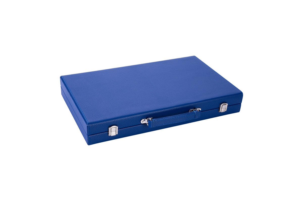 15 inch backgammon set covered with imitation leather case with blue, grey and white felt inside. Contains 4 dice, 1 doubling stone, 30 chips, 2 dice cups and instructions