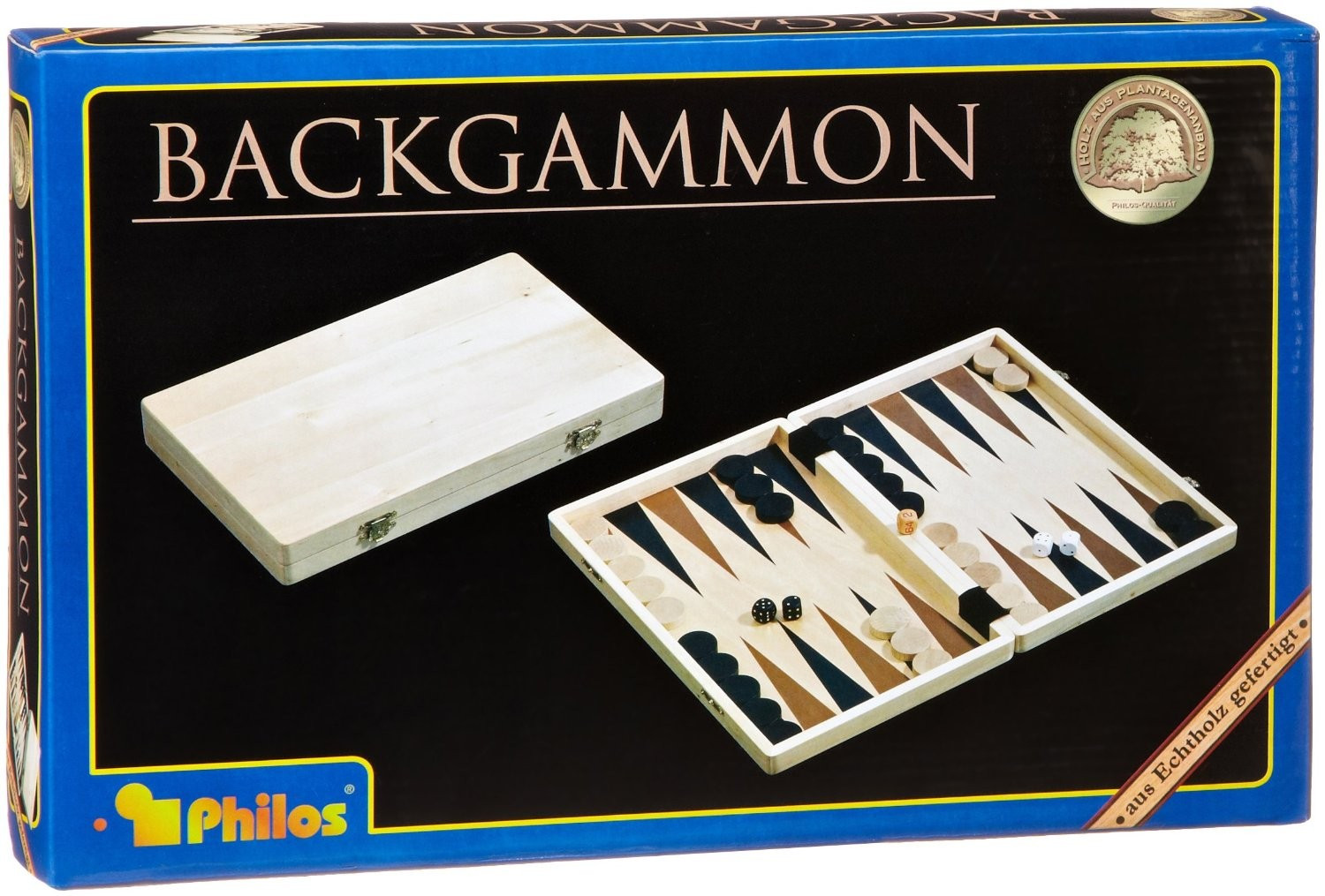 Backgammon chest. Natural wood with printed playing field. Wooden pieces.Dimensions closed: 33 x 21 x 4 cm.Dimensions open: 33 x 42 x 2 cm