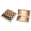 Wooden, reversable, chess / backgammon set, with complete sets of playing pieces. A 28.7cm x 28.7cm (approx) wooden chess board, which can be folded in half for easy storage or travel. There is enough room inside to store both chess and backgammon pieces. The case is kept closed with a metal clasp. The backgammon board is on the underside of the chessboard, and included in the pieces are 2 miniature dice. Backgammon stone size: 1.9cm approx Chess king size: 6.5cm approx. Ages 3+.