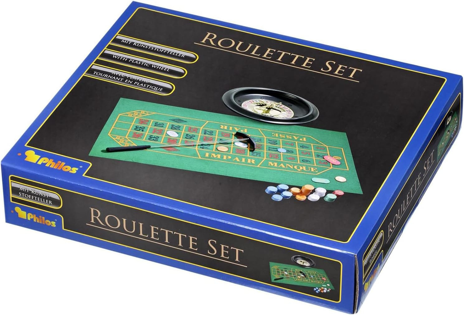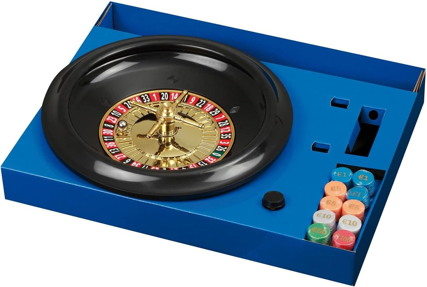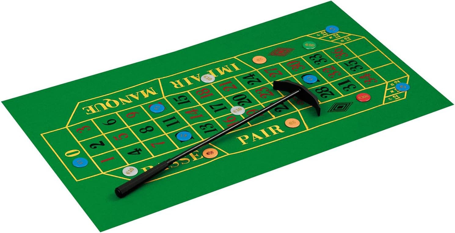An advantageous edition of the roulette game, one with a plastic soucer and a plastic wheel. Including 100 goldprinted chips,2 metal balls, rake and cloth of 80x30 cm.