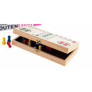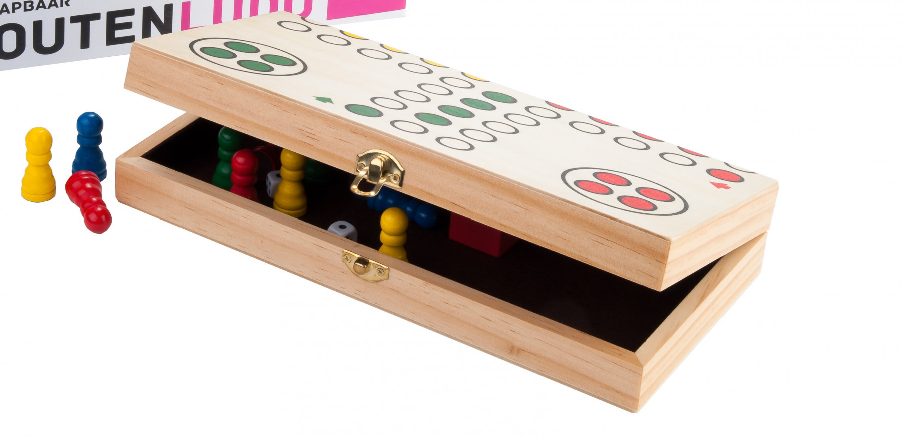 folding wooden ludo board with clasp felt bottom wooden pieces and 2 dice all components store away in the wooden board so no lost pieces large wooden ludo board 30 x 30 cm when open
