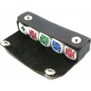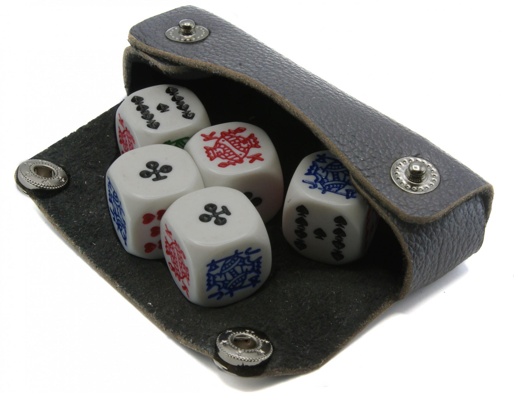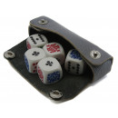 Leather case containing a set of five high quality Poker dice with colour embossed playing card faces. Playing card for size indication only.