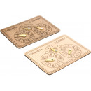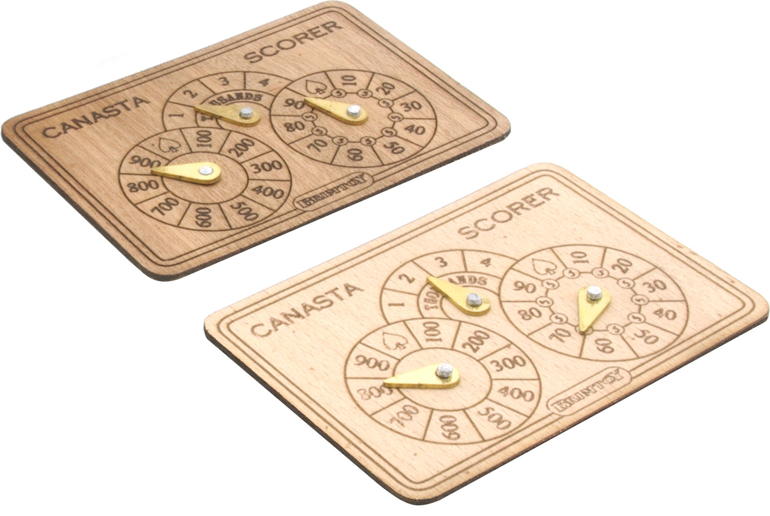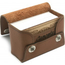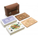A handy pocket-sized Canasta set in a Scottish hide pouch with a a pair of wooden Canasta score markers and two packs of Canasta playing cards.