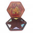 Chinese chequers set in Antique style box embossed with decoration of Chinese themes. Contains six sets of glass playing pieces in different colours.