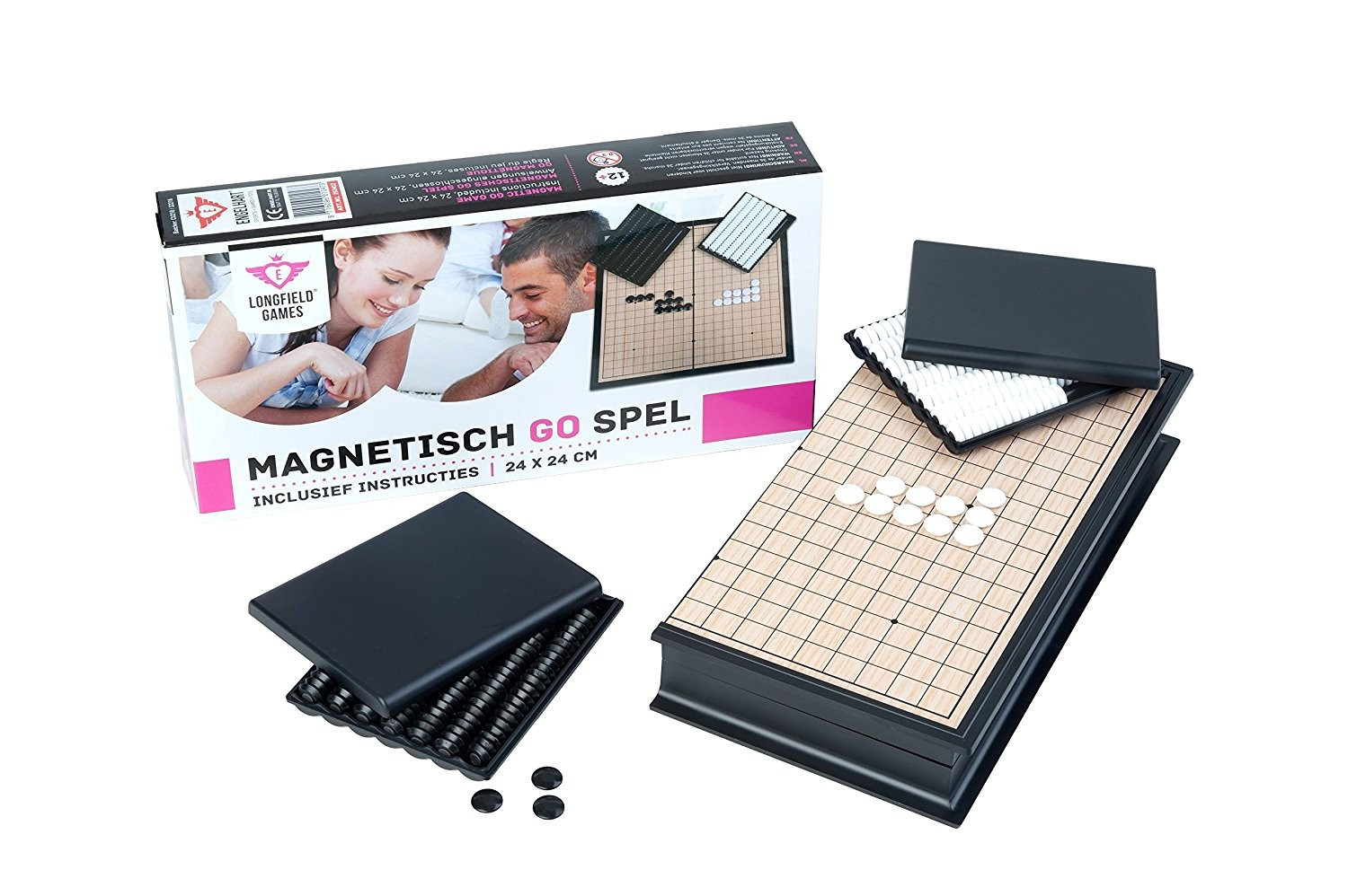 Travel magnetic GO set. Foldable GO game, luxurious quality in a colour box. The GO game has magnetic play pieces so the pieces have more grip on the game board. The GO game comes with instructions. The Go stones can be stored in the box. The dimensions of the game board are 24x24 cm. The Go board has a 19 x 19 square grid board with 9 intersections.