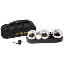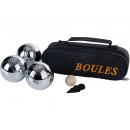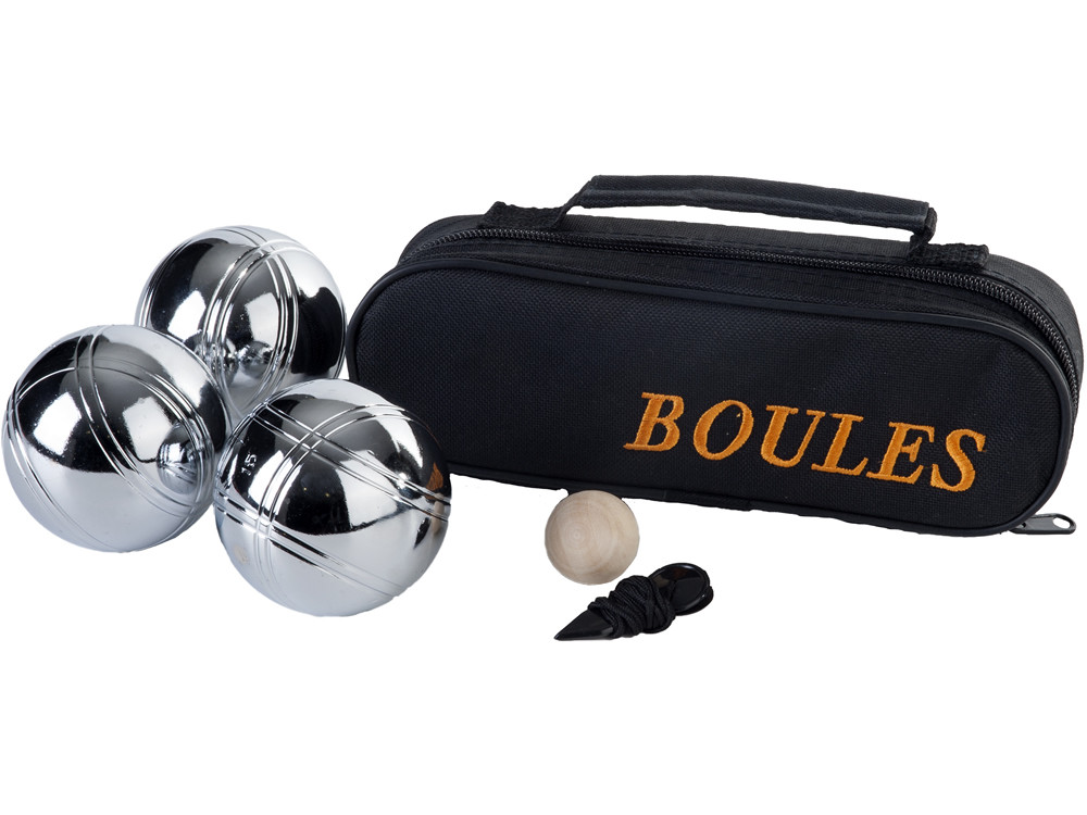 Boules 3 balls with target ball and measurement in black zipper bag. Diameter of the balls is 74mm and weight is about 720gram. Rules of the game included.