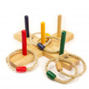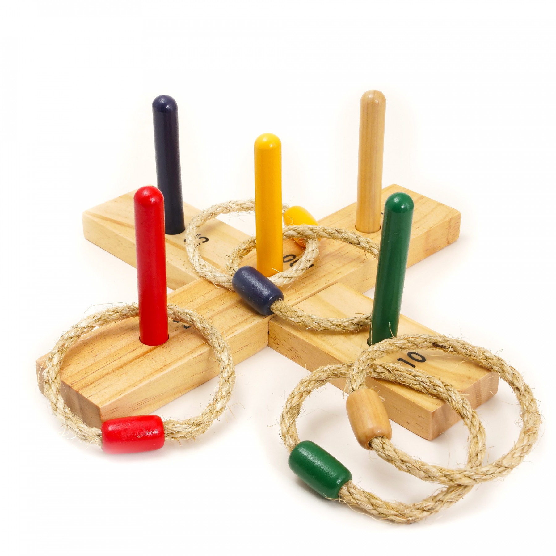 Quoits has been played in many forms for centuries, possibly even dating back to ancient Greece. In the 19th century it became widely popular and it was adopted as ‘Deck Quoits’ to play on board ship. This inexpensive little set is a great introduction to the game and is small enough to take anywhere. With a wooden cross and pegs and rope rings.