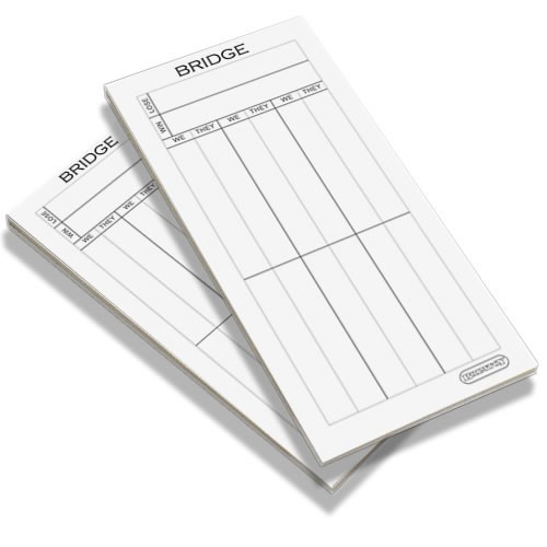 A pack of hard-backed score card pads for Bridge. Score Cards Size: 21 x 10cm. 50 sheets per pad. 2 pads supplied.