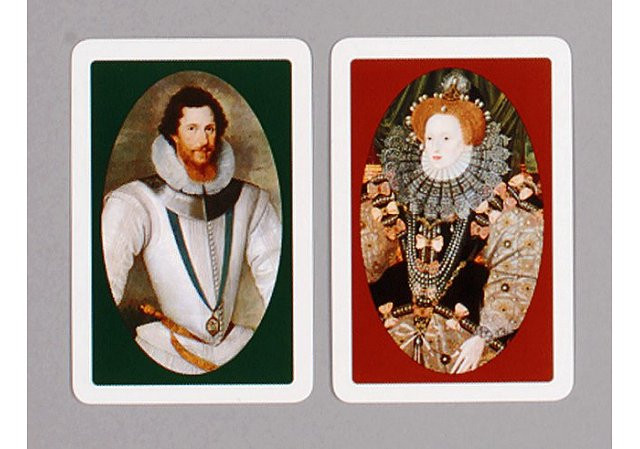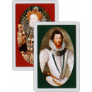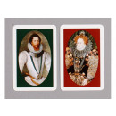 A twin pack of playing cards with portraits of Earl of Essex and Queen Elizabeth I. Plastics coated and produced on top quality playing cardboard with a black centre. Made in Belgium. Includes a gold presentation box. Carded on base and cellowrapped.