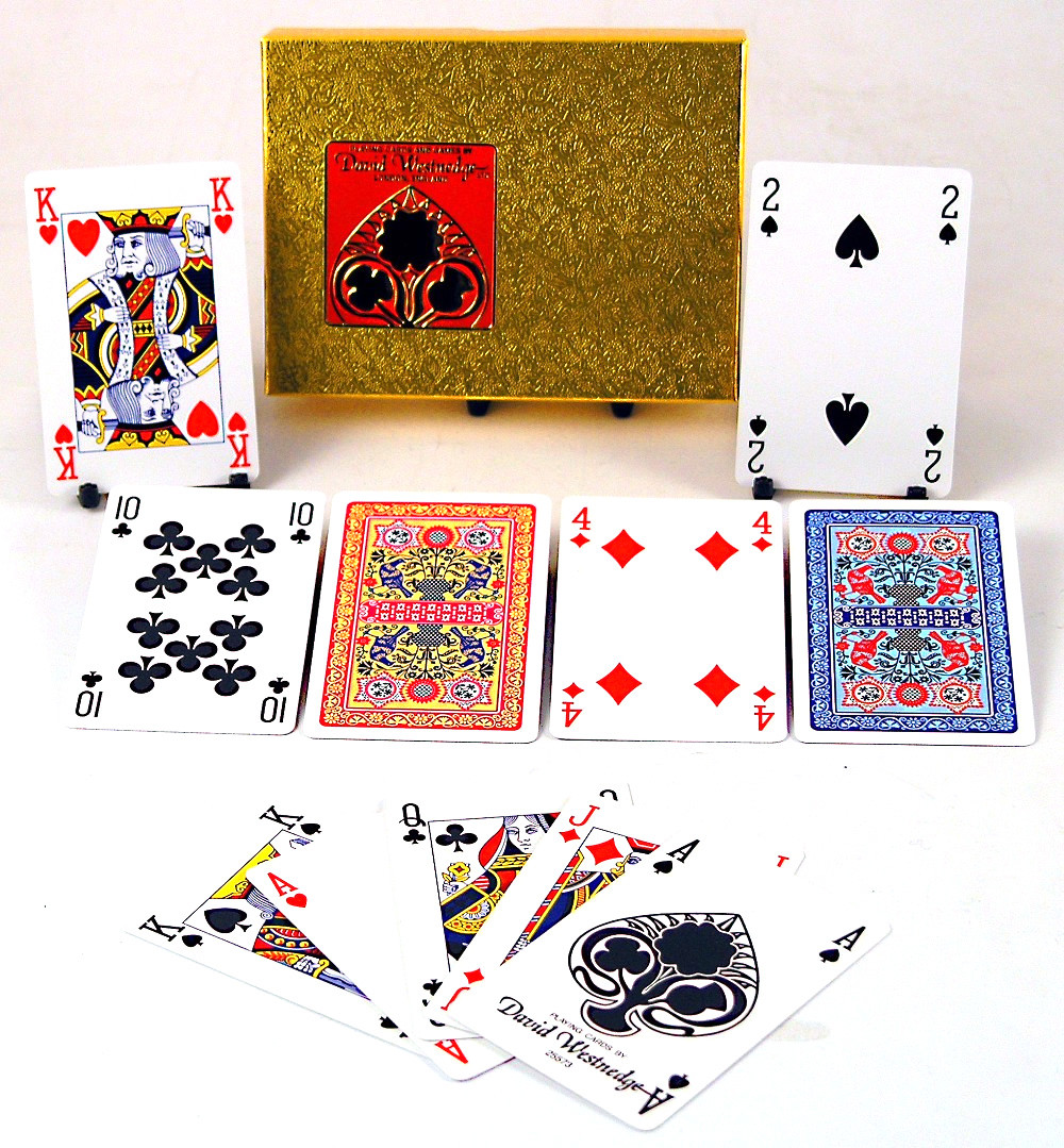 David Westnedge twin pack of playing cards with pigeons design. Plastics coated with a black centre, produced on top quality playing card board. Supplied in a twin gold drop lid presentation box, carded on base and cellowrapped. Card size: 89 x 58mm